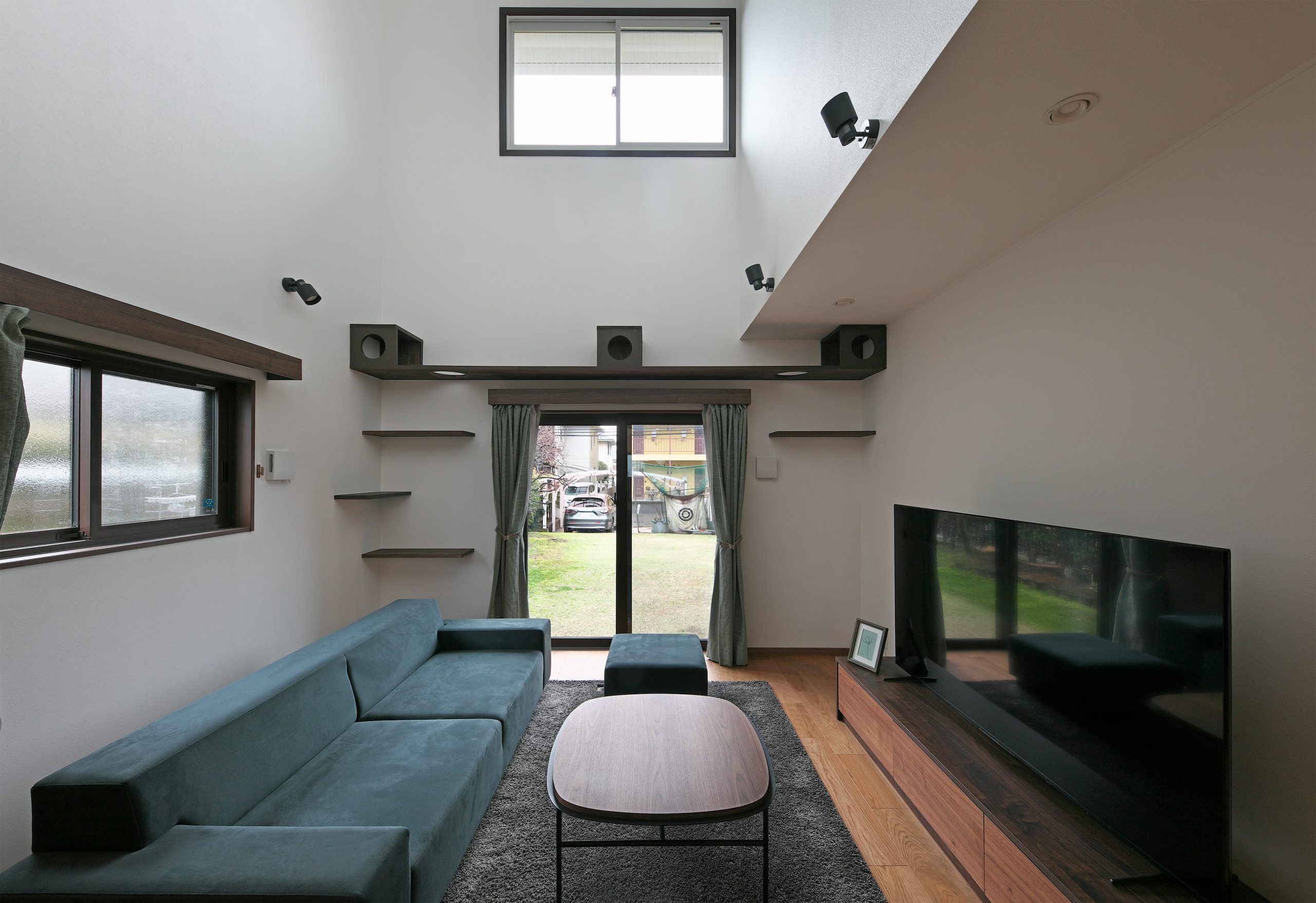 吹き抜けから降りそそぐ光と、落ち着いたグリーンのアクセントが調和するリビング...