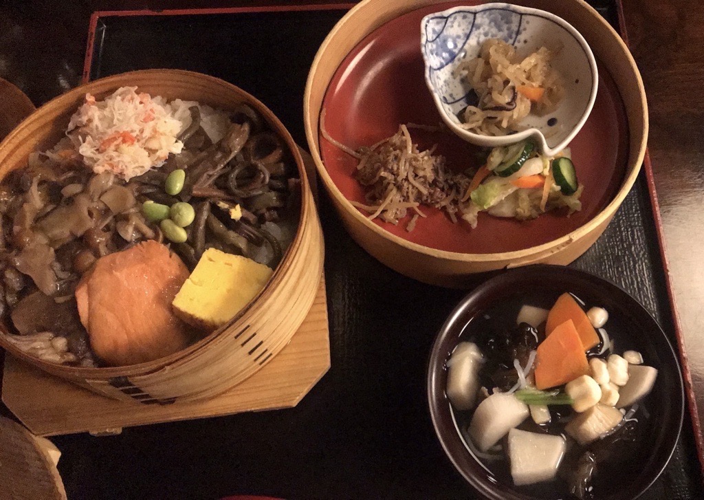 木を曲げて作る曲げわっぱにご飯を入れて、海鮮やきのこ、山菜などをのせて蒸したものが「わっぱ飯」で味も見た目も上品で美味しいです♪