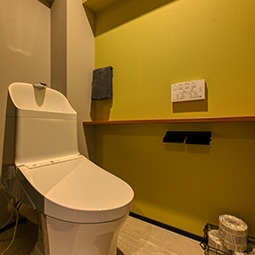 深みのあるイエローグリーンの壁が印象的なトイレ。