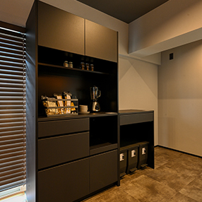 見せる収納と隠す収納のバランスが美しい生活感を抑えたブラックのカップボード。