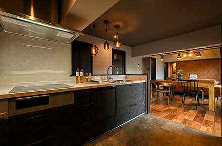キッチンは位置を移し、リビング全体を見渡せるように配置。家族の気配を感じながら料理ができるオープンな空間となりました。落ち着いたトーンでまとめたインテリアの中に、ペンダントライトのあたたかな光がキッチンをやさしく包み込みます。家族も自然と家事に参加しやすく、食事の支度を手伝ったり、食後にテーブルを囲んで今日の出来事を話したり。そんな何気ない時間が、家族のつながりを深めています。